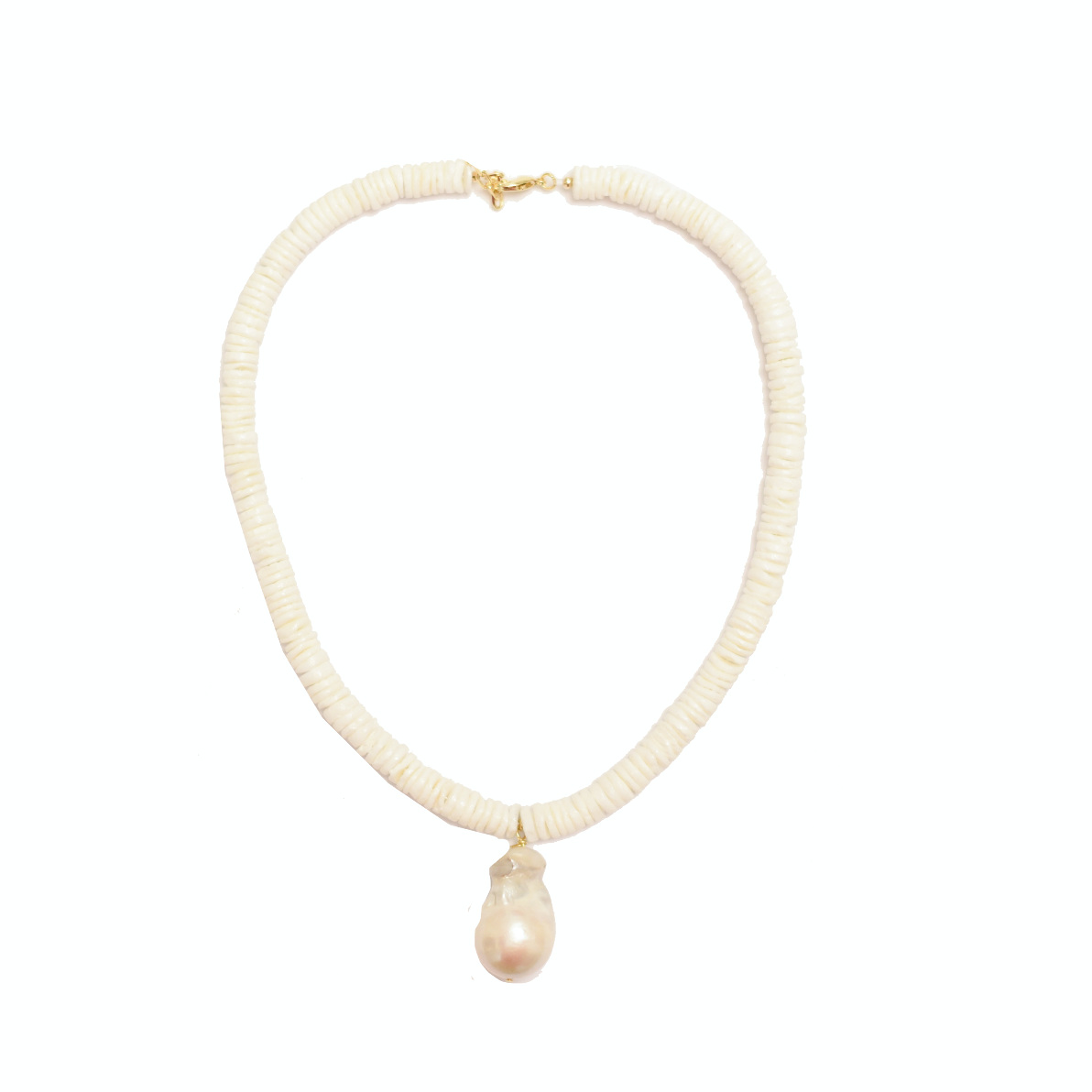 Real shells, freshwater baroque pearl, gold filled finishes. 16-19" adjustable.