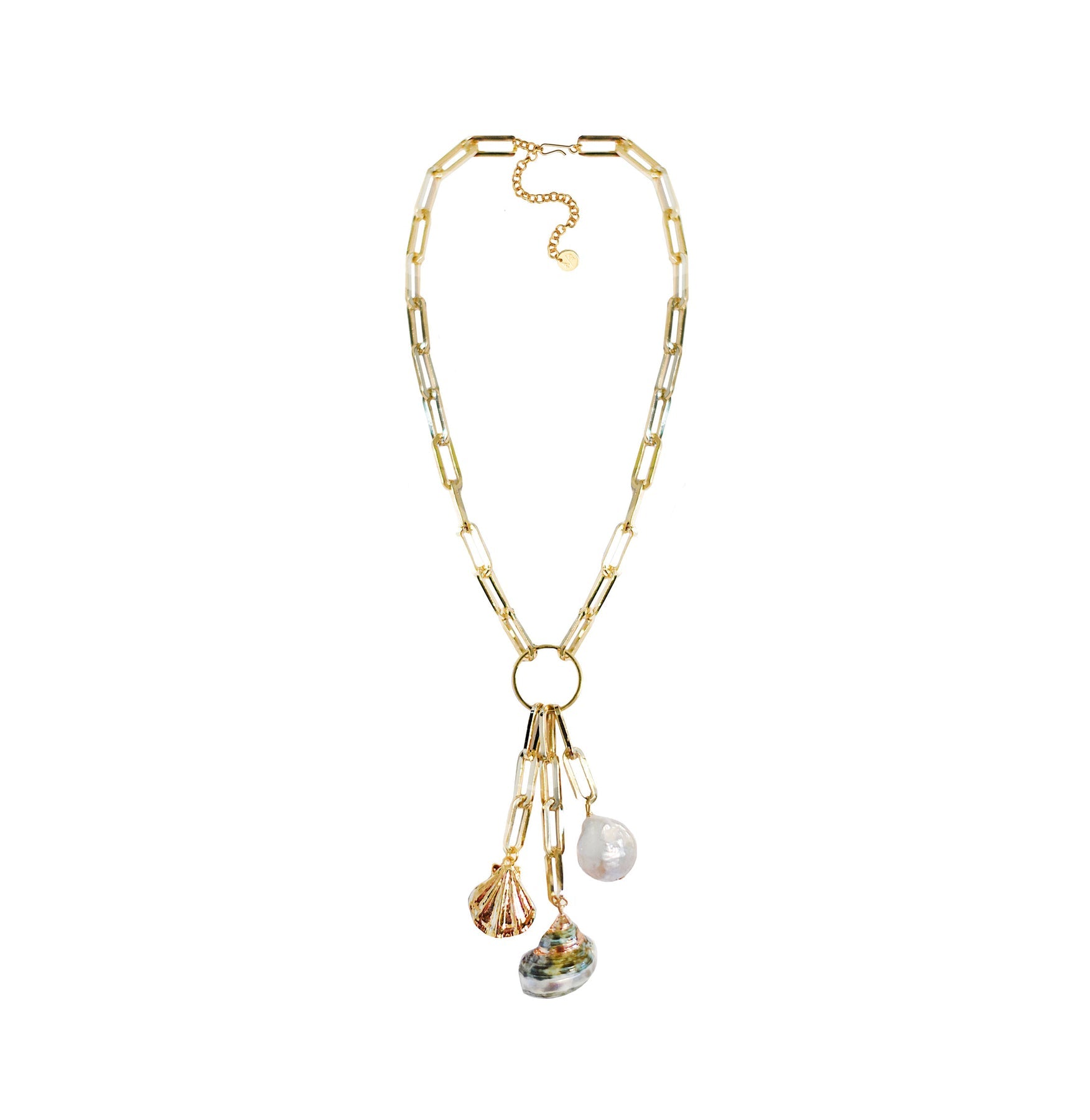14k gold plated brass, freshwater pearl, natural gold-dipped shell, 16"-19" adjustable with approx. 4.5" drop.