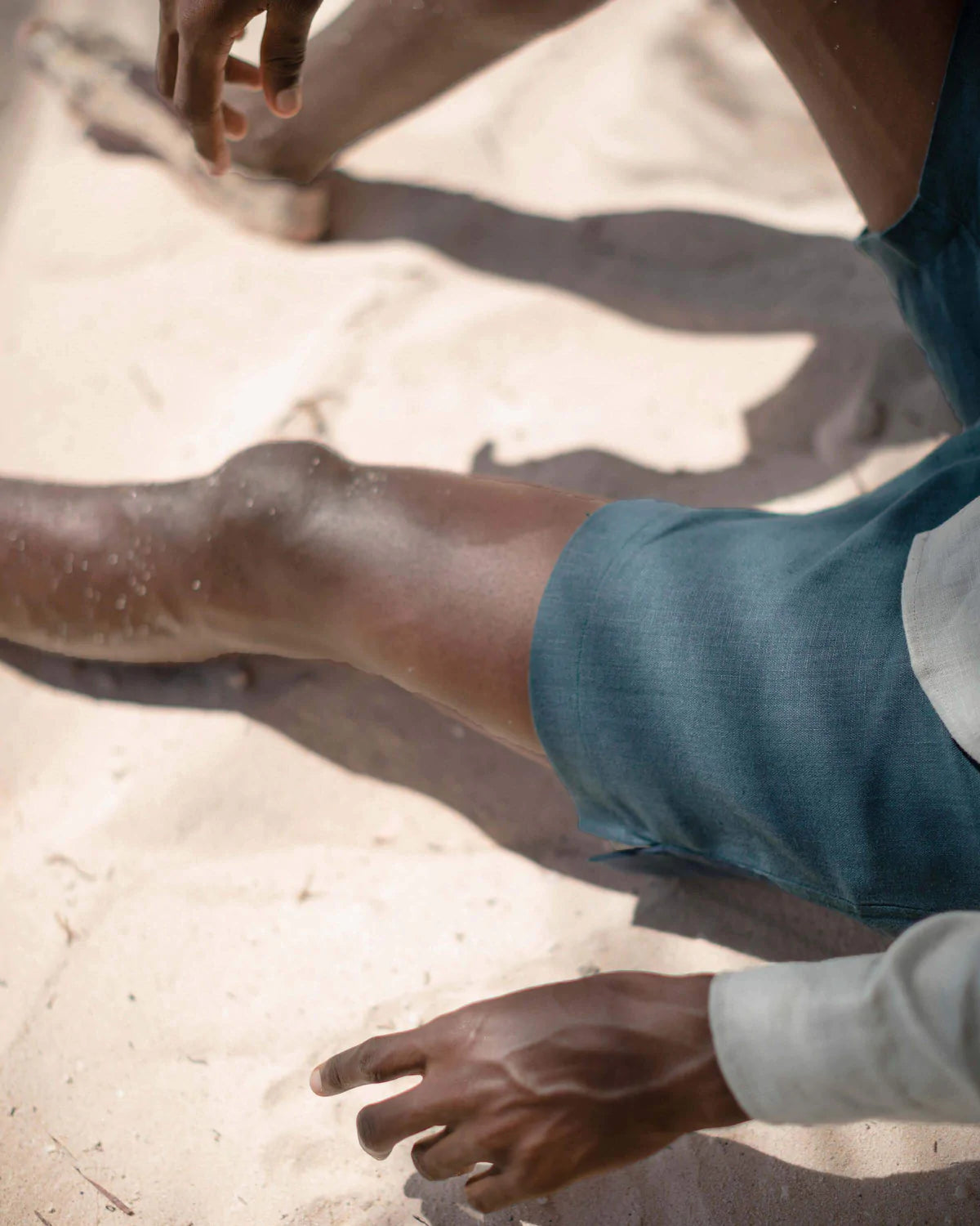 A blue linen drawstring short made with sustainably-grown French linen and washed with biodegradable softeners.
