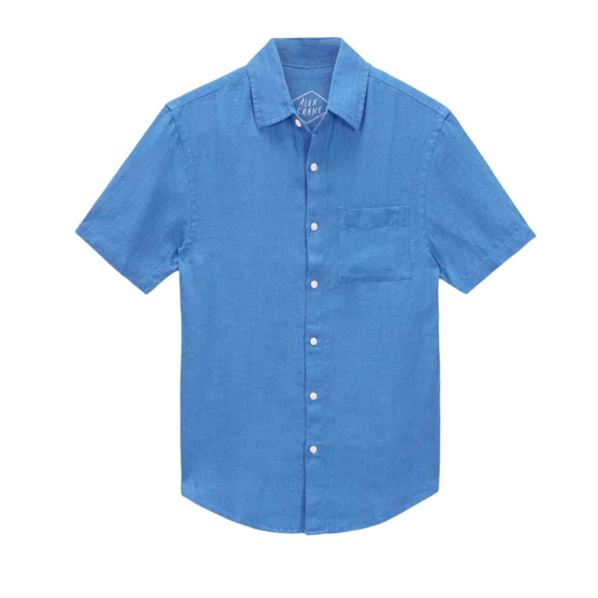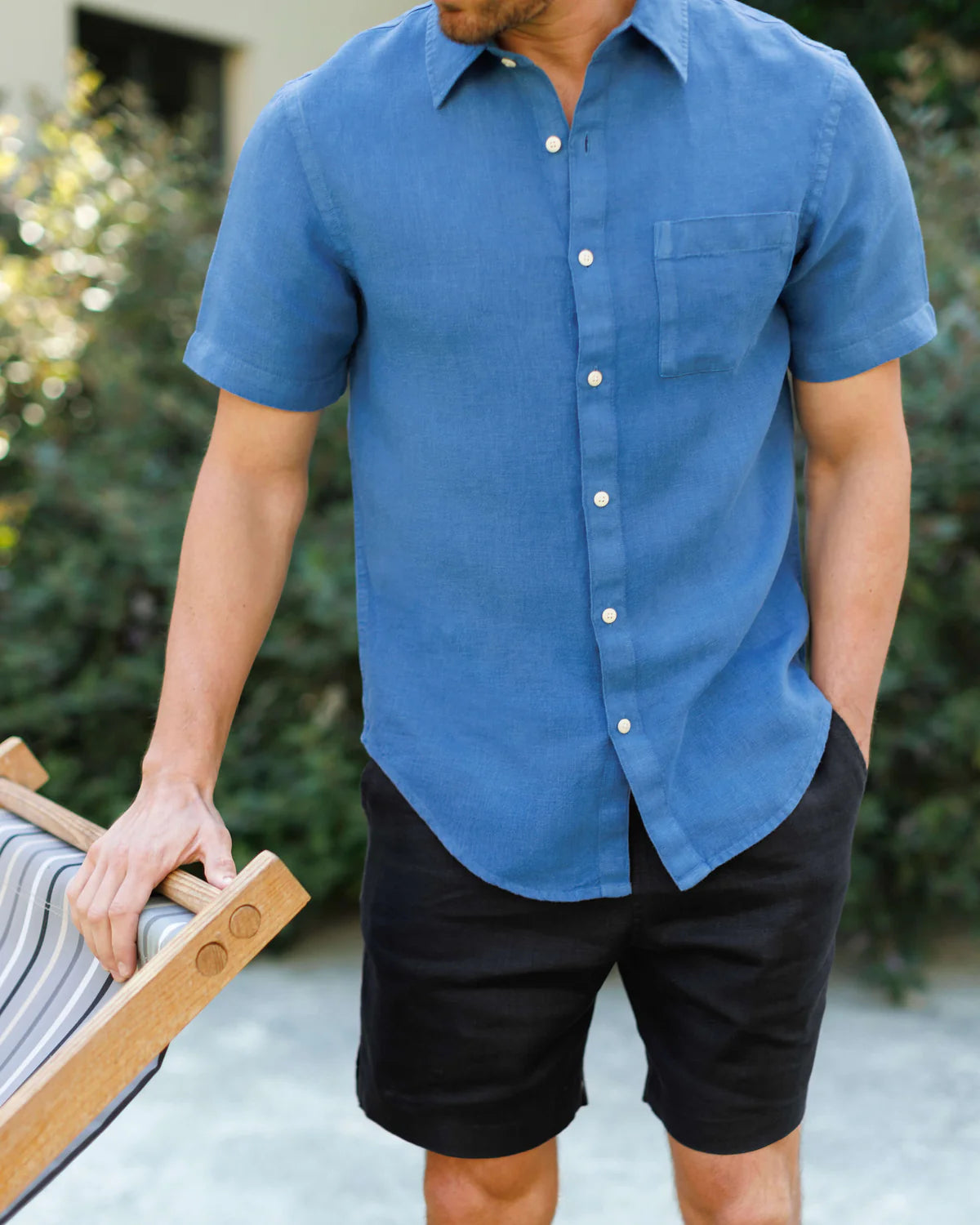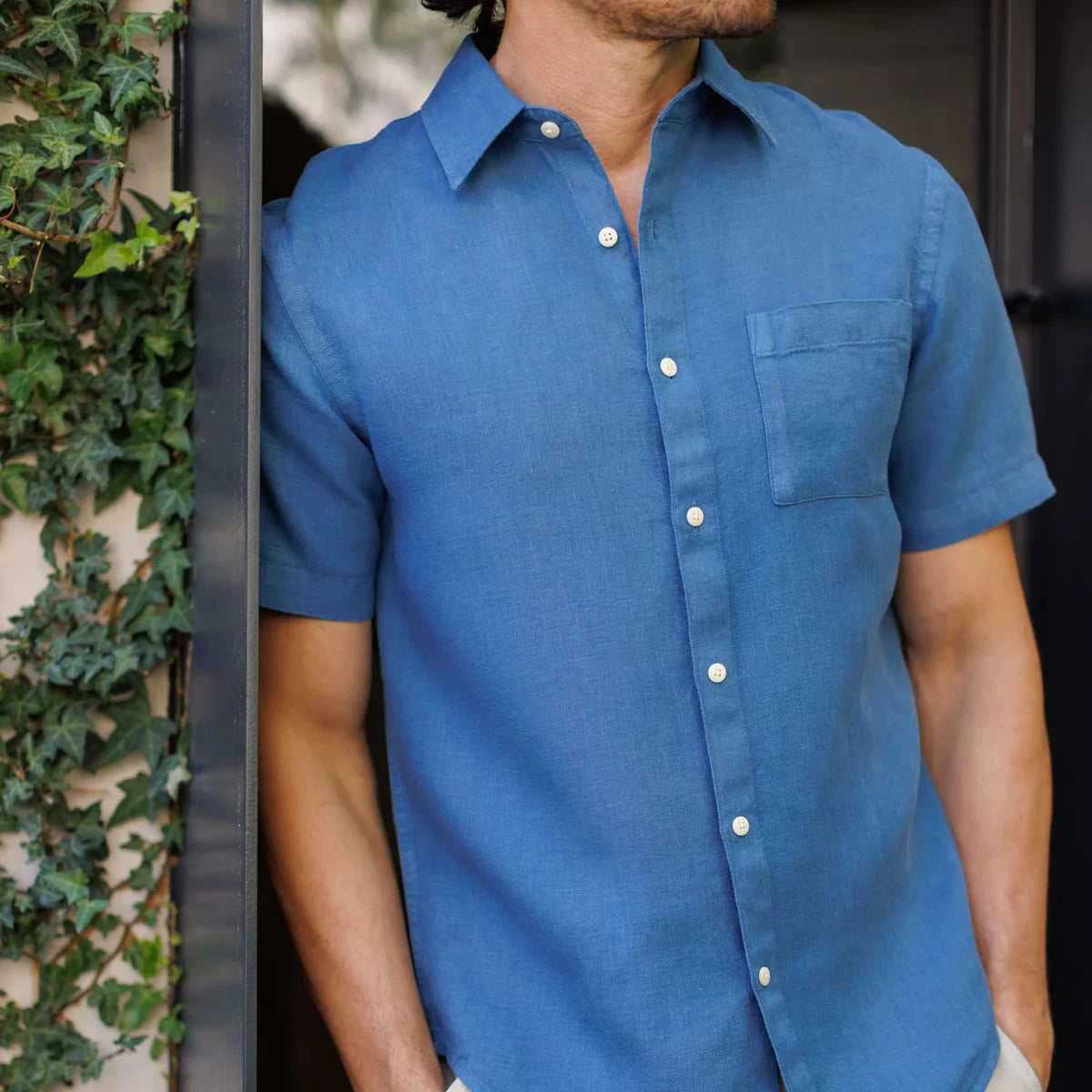 A deep blue short-sleeve button-down shirt made with sustainably-grown French linen and washed with biodegradable softeners.