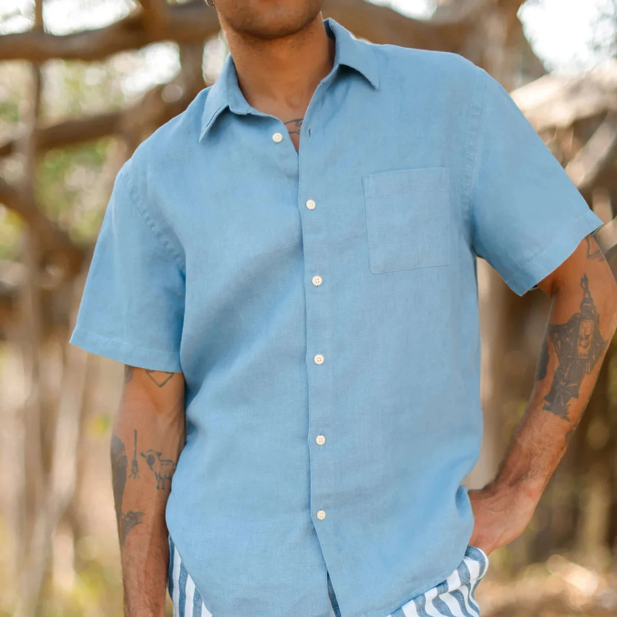 A bright blue short-sleeve button-down shirt made with sustainably-grown French linen and washed with biodegradable softeners.