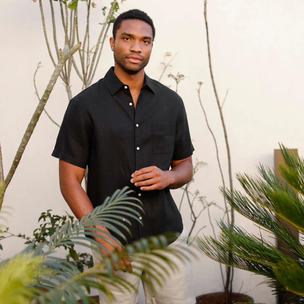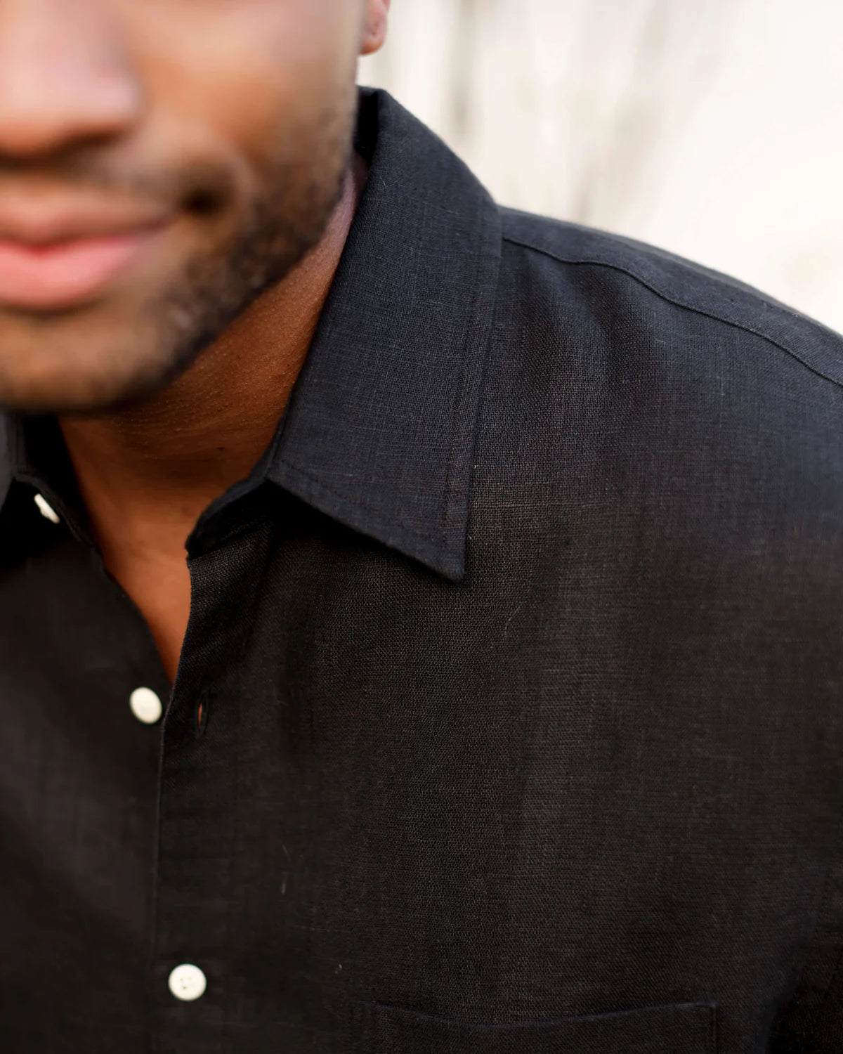 A black short-sleeve button-down shirt made with sustainably-grown French linen and washed with biodegradable softeners.