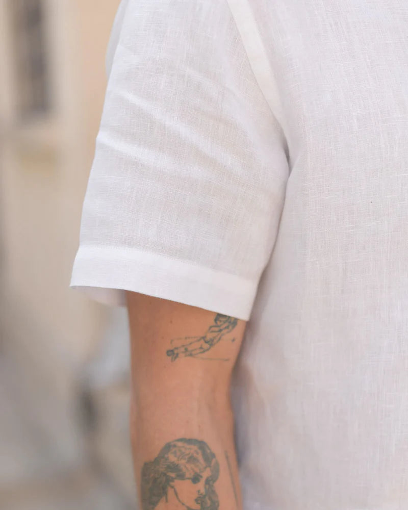 A white short-sleeve button-down shirt made with sustainably-grown French linen and washed with biodegradable softeners.