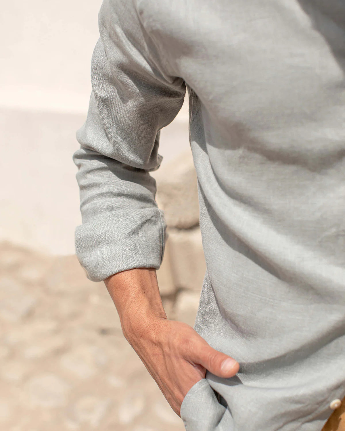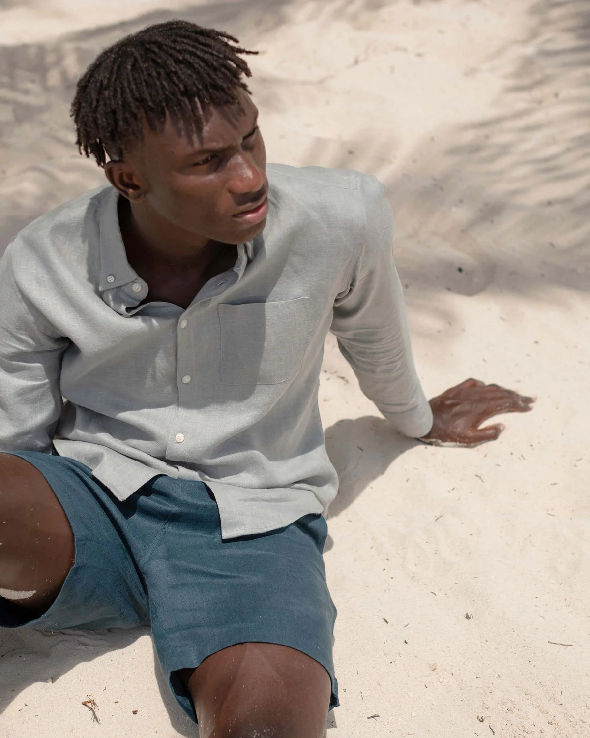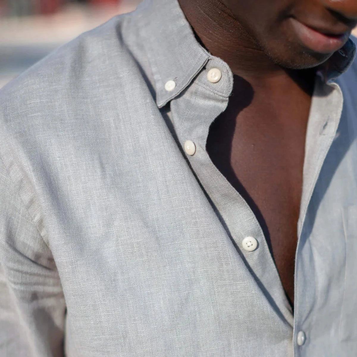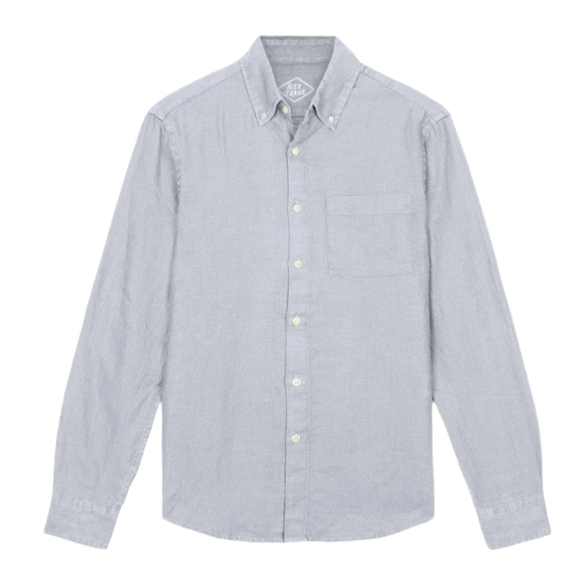 A grey-blue linen button-down shirt made with sustainably-grown French linen and washed with biodegradable softeners.