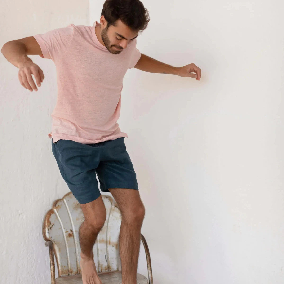 A faded pink linen t-shirt made with sustainably grown French linen, knit in Portugal and washed with biodegradable softeners.