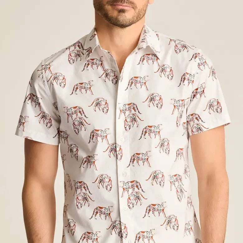 A French placket gives a smooth look to a slim-fitting sport shirt crafted from breathable cotton enhanced with stretch and patterned in a wild cheetah print.