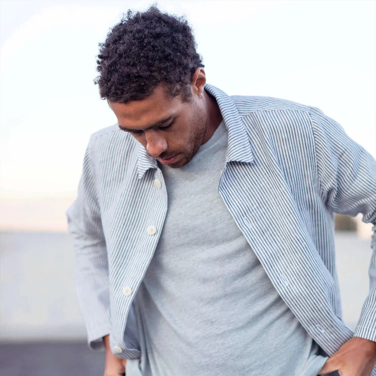 A blue-grey linen t-shirt made with sustainably-grown French linen, knit in Portugal and washed with biodegradable softeners.