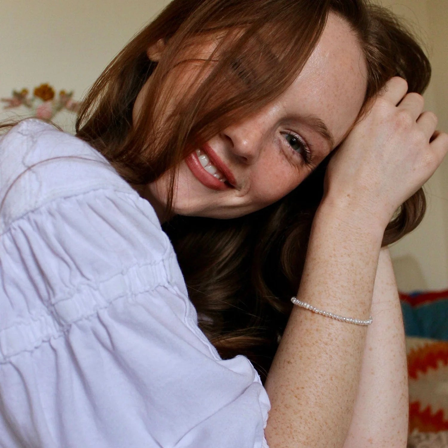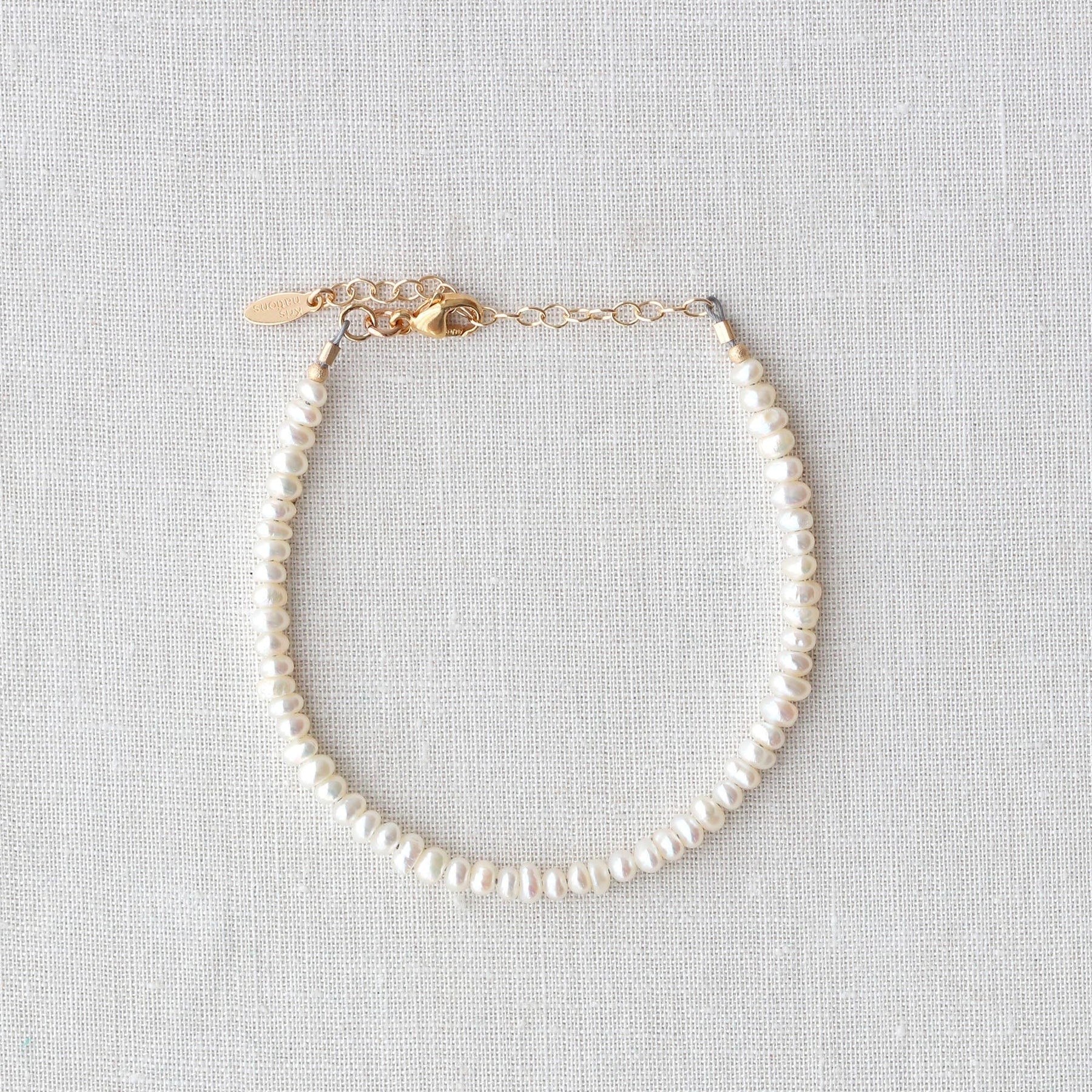 Freshwater pearl bracelet crafted with tiny, lustrous seed pearls. Each delicate pearl shimmers softly, creating a refined yet playful aesthetic. When stacked with a classic chain bracelet, the contrast of textures adds a touch of modern sophistication. The bracelet’s versatility makes it perfect for everyday wear or special occasions, offering a graceful accessory that complements other pieces without overpowering.