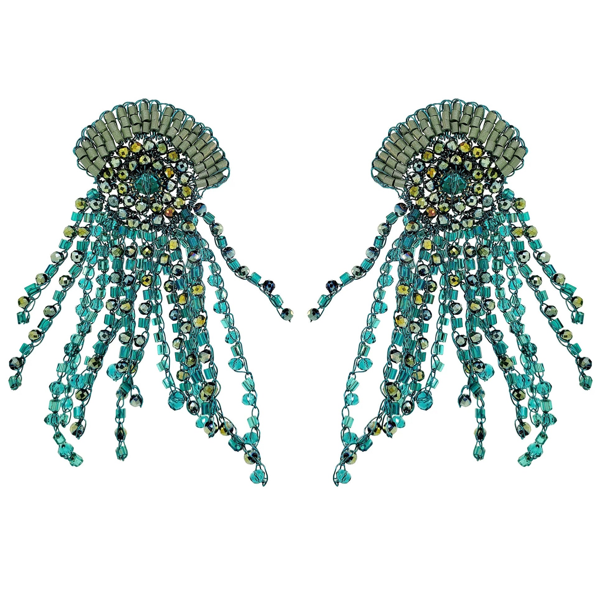 These stunning large handmade earrings are crafted by talented Brazilian artisans using enameled wire and a rich combination of crystals in teal tones. Their organic design radiates warmth and sophistication, making them a perfect statement piece for any occasion. Made from hypoallergenic and nickel-free materials, these earrings beautifully blend artistry, color, and craftsmanship. Stunning jewelry that will last for a lifetime.