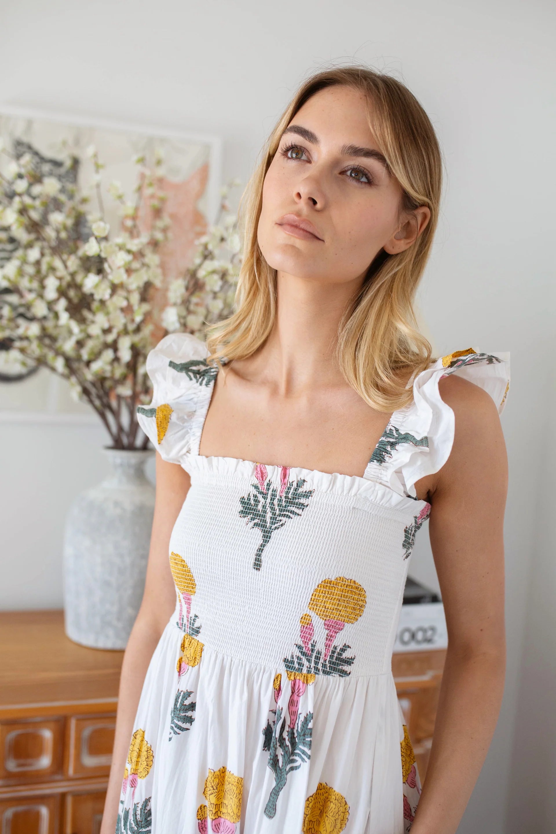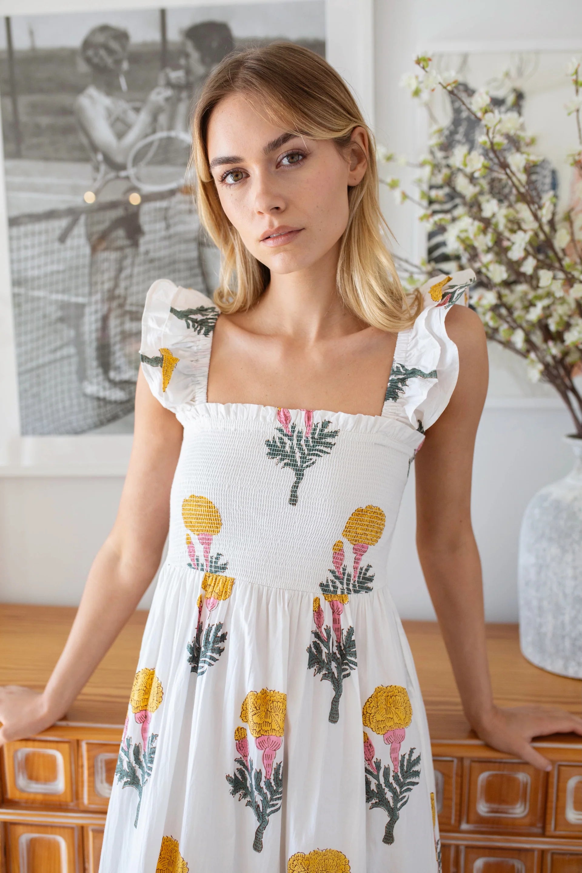 Meet the best selling Sasco Dress in the Marigold print, the perfect blend of fun and flirty! This stunning silhouette features a smocked bodice for a comfortable, supportive fit—no bra required. The ruffle sleeves add a feminine touch, while the staggered hem, slightly shorter in the front and longer in the back, creates playful movement.