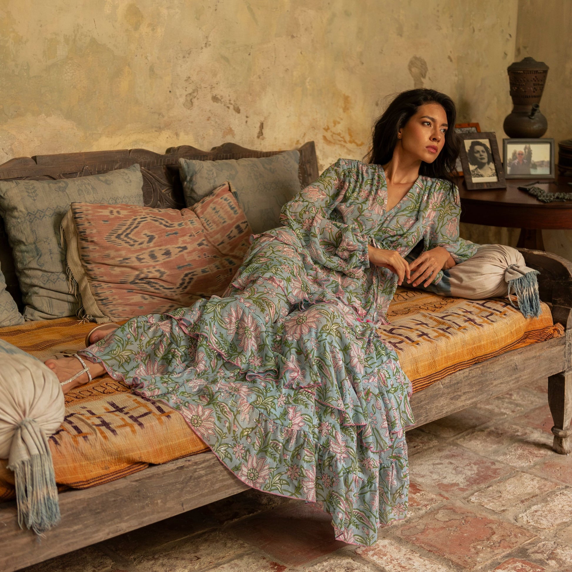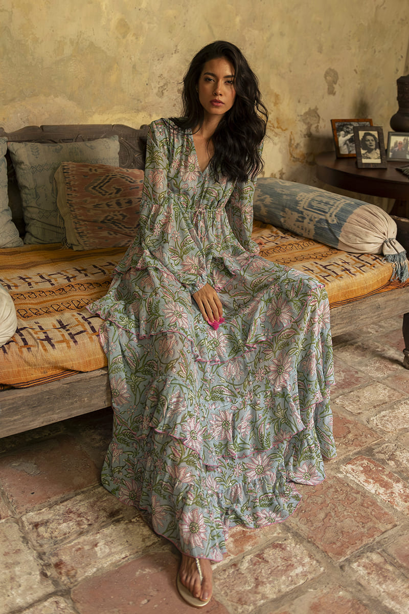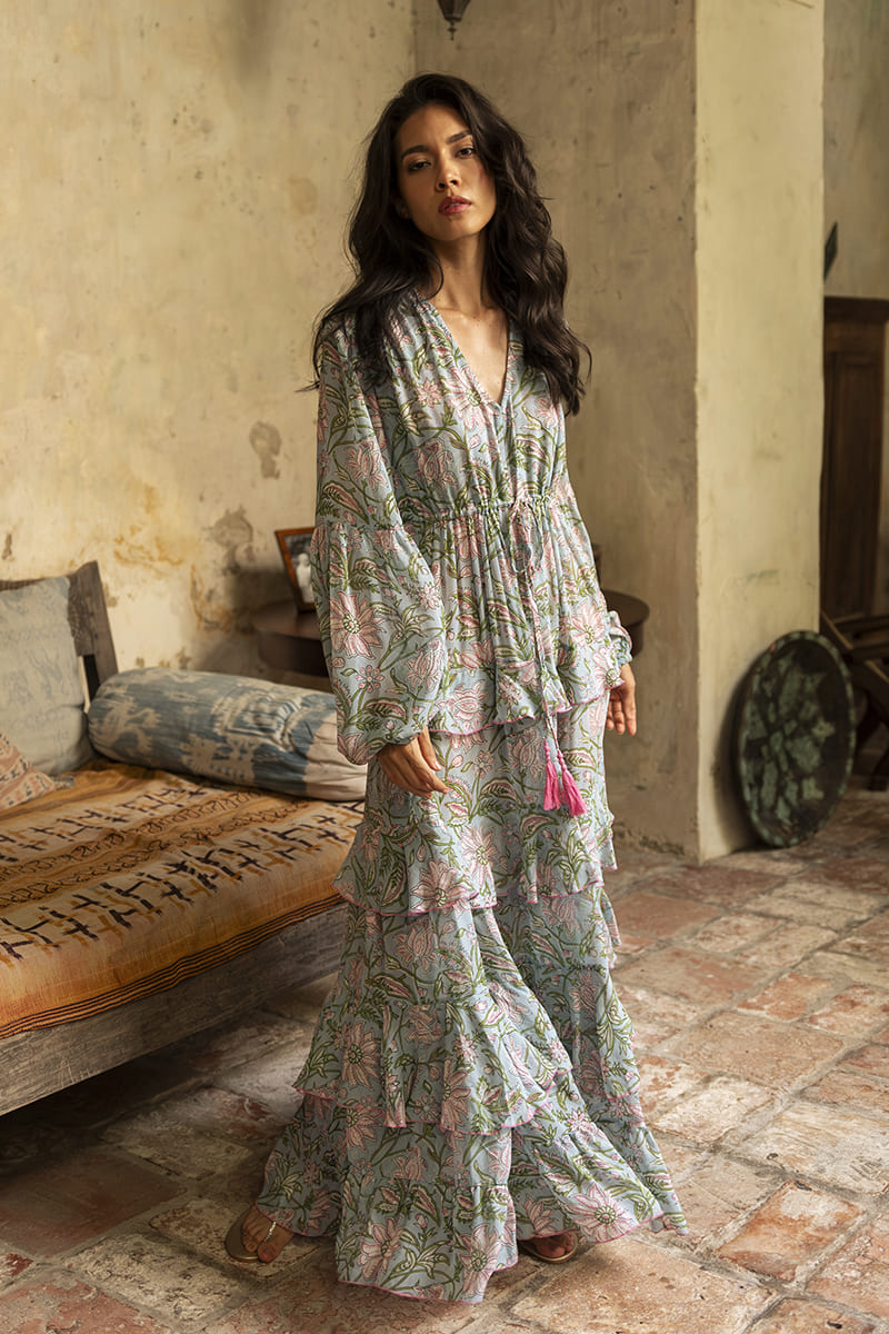 This long dress for women shows an immoderate love for delicate detail with its floral print, its tender shades of pink and blue evoking sublime holiday evenings. Embrace the essence of bohemian-chic style in its most beautiful expression, with our modern and sophisticated Rosa.