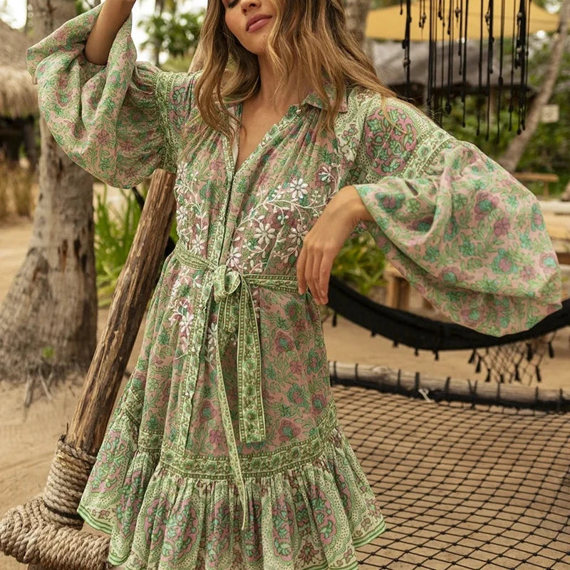 Prepare for your next escapade with the Short Carolina Dress. Its bohemian style is sure to brighten up your journey. The long sleeves with gathered cuffs provide an elegant look, letting you breathe in an air of lightness. Fall in love with the floral print punctuated by delicate embroideries and hypnotic colors, a true ode to timeless beauty. Buttons allow you to customize the neckline to your liking.
