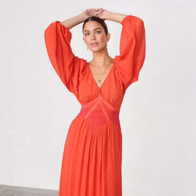 This dress is the perfect day to night outfit. The pink smocking along the midriff paired with the blouson style sleeves creates a floaty silhouette that screams effortlessly chic. Keep it simple with some sandals and minimal jewellery.