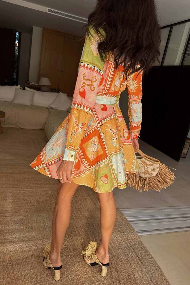 Cut from a crisp cotton linen, with the new Soller print, multicoloured imitation patchwork with motifs that tie our trip to the balearic islands, with the inspiration found at Colombia Road market, all together in a composition of beautiful cameos, with central images of vases, tigers, suns and scales in varying arrangements.With a tie waist fastening to accentuate your silhouette it's perfect for the changing seasons.