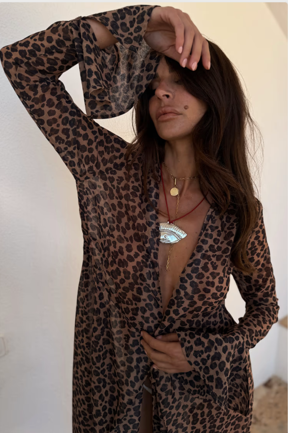 In a slightly sheer leopard print this dress is the perfect touch of sexiness to add to your summer wardrobe. Tie your own way to create a dress that comfortable for you. With fluttery buttoned cuffs and a flattering v-neckline, add some strappy heels, to create a sultry day to night look. Can also be worn over a swimsuit as a cover.