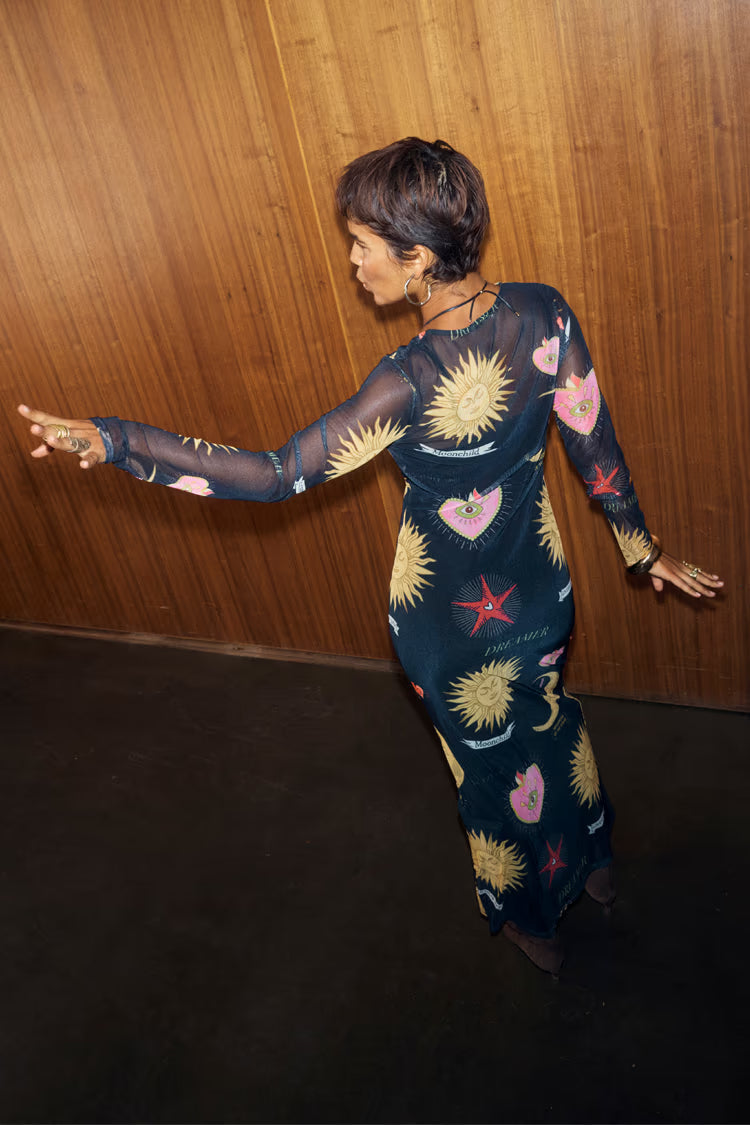 You guys loved the mystical print so of course we had to bring it back in the iconic mesh base! A feel good print with beautiful jacquard motifs, inspired by the accents of gold and silver accompanied by engravings of suns and moons that can be found throughout the souks of Marrakech. Add the slip underneath for extra coverage or for more sexy styling wear over underwear or a swimsuit.