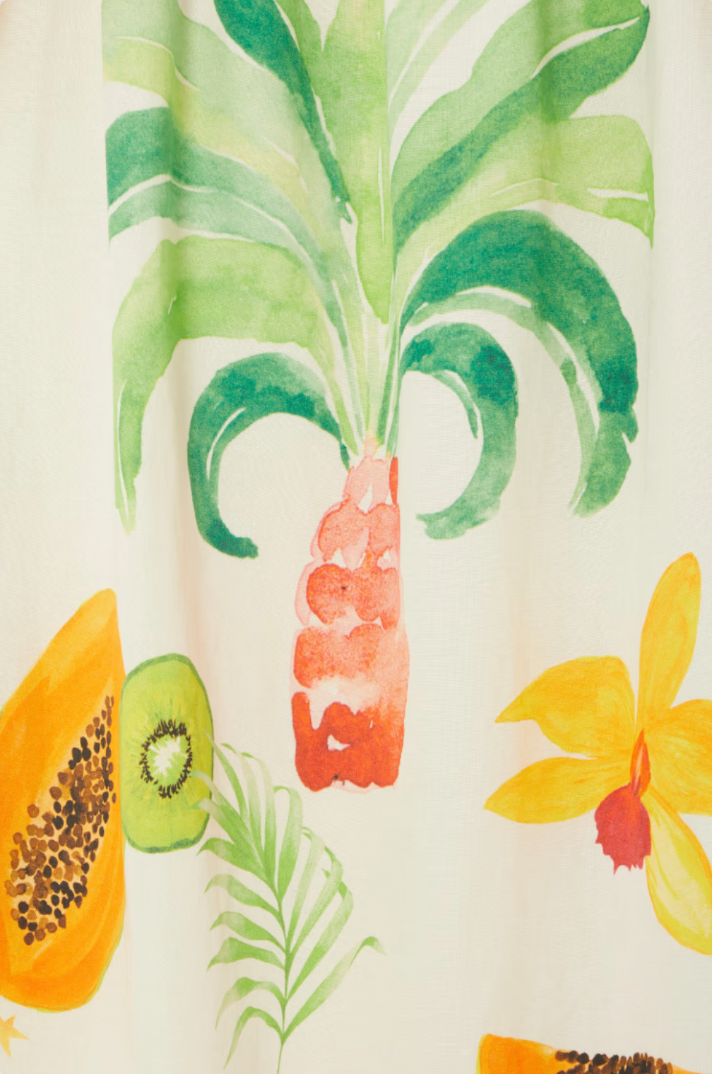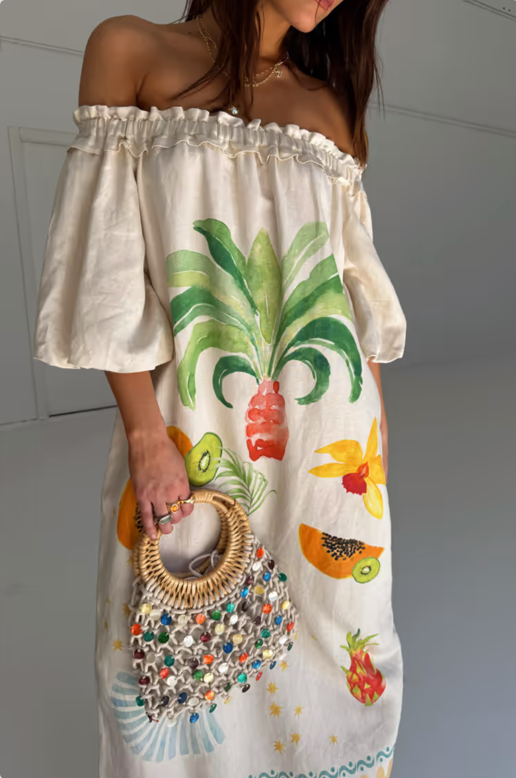 Crafted in a beautiful, lightweight linen blend, this dress seamlessly combines comfort with style. With hand painted motifs from our Rio print, designed in-house by our amazing design team and features a range of tropical fruits on a cream base that transports you to the joyful atmosphere of a hot summer afternoon! The elasticated ruffled neckline allows you to wear in a myriad of ways, whether you're strolling along the coastline or enjoying a casual brunch with friends, this dress promises to make you feel effortlessly chic!