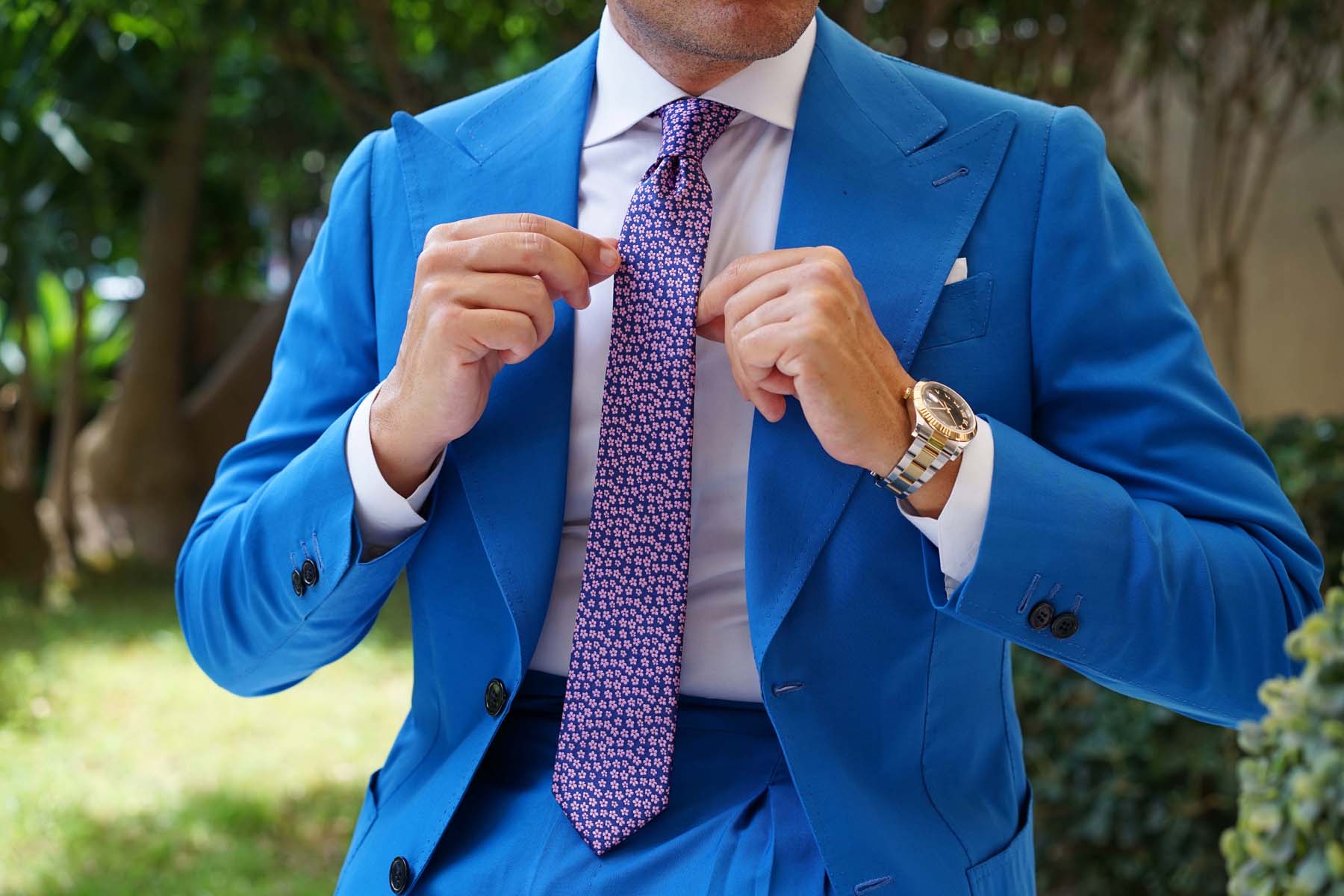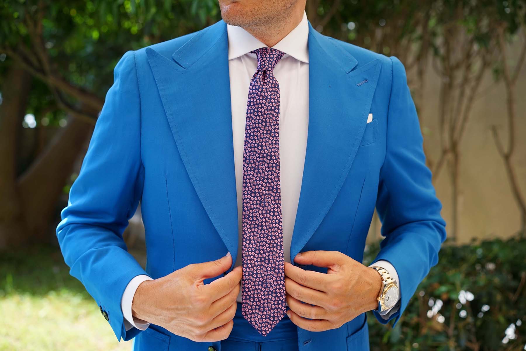 The Pink Plum Blossom Floral Skinny Tie is sure to carry any ensemble with the gentle elegance of a blossom in the breeze. Known as Sakurain Japanese, these gems are a perfect symbol of a fine Spring day, with the blueberry tones making for a striking accompaniment to your getup.