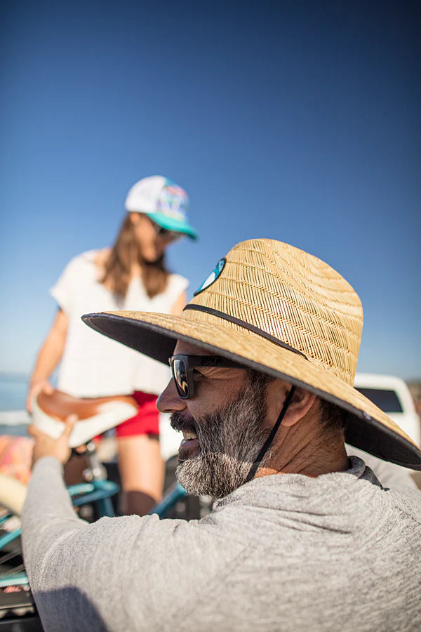 Ideal for those who work and play in full sun. Made from 100% natural straw with custom artwork by Carlos del Rio.