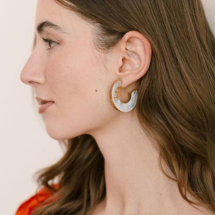 The Botanical Wheel Hoops are a fresh take on the classic hoop style with delicate blue floral detailing. These earrings offer a soft and elegant statement, perfect for elevating your everyday look.
