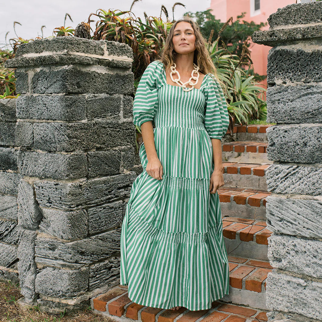The Green and White Stripe Tula Dress, worn on or off the shoulders, features bold stripes and statement bubble sleeves in a breezy, relaxed fit. Perfect for any occasion, it blends playful charm with effortless sophistication.