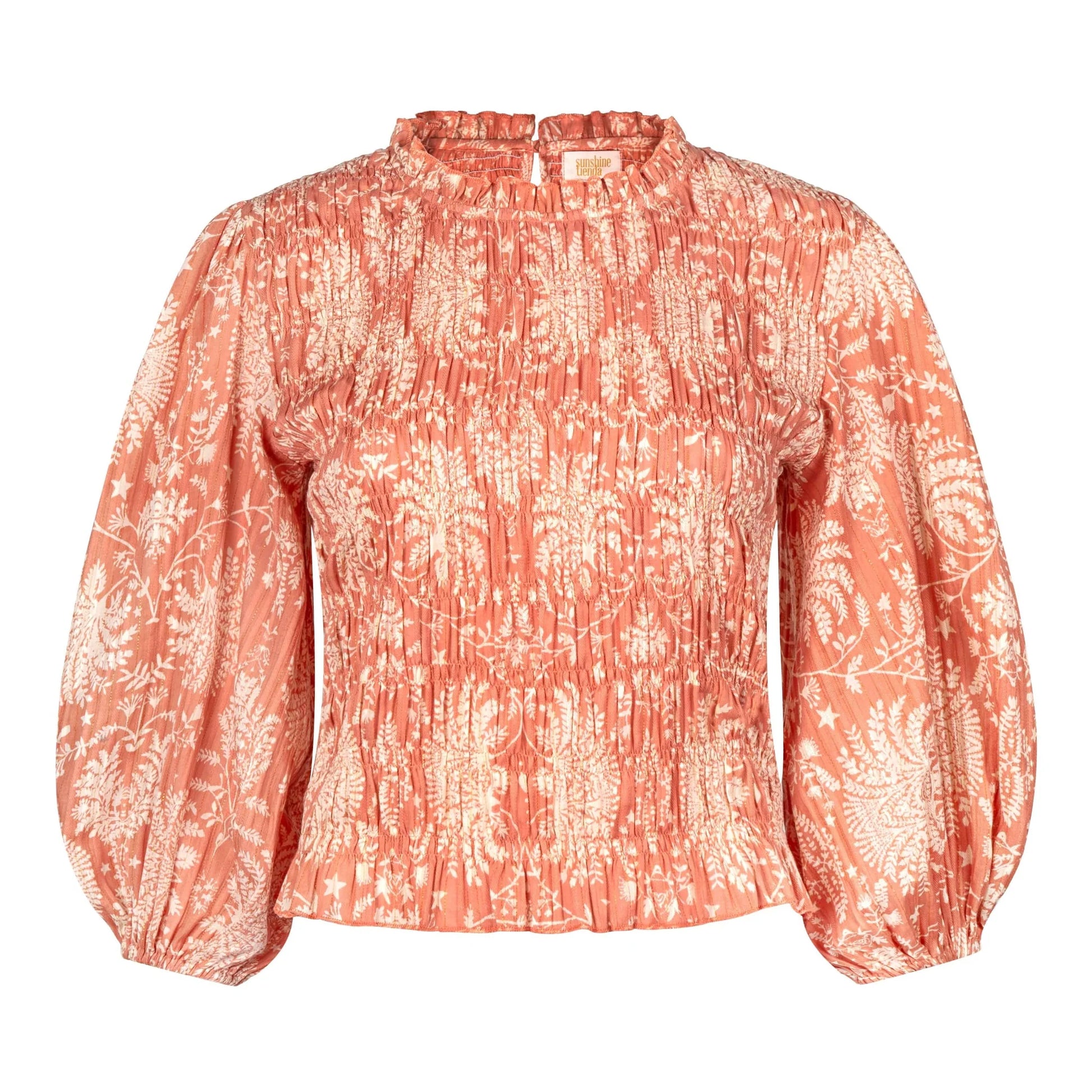 The Rose Gilded Palm Hali Top exudes elegance with its delicate palm print in soft rose hues and shimmering accents. Featuring pleated details and voluminous sleeves, it’s a refined choice for both daytime and evening occasions.