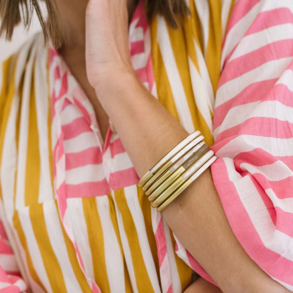 These lightweight Metallic Gold Mix Bangles add a touch of shine with the gold lacquer. They are incredibly lightweight and very comfortable to wear on the daily! Sold in a set of 6..