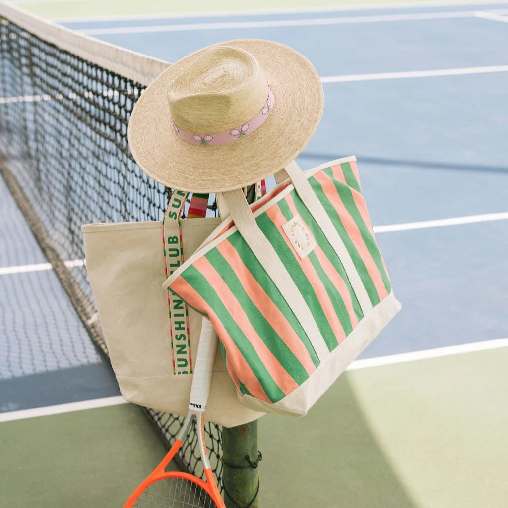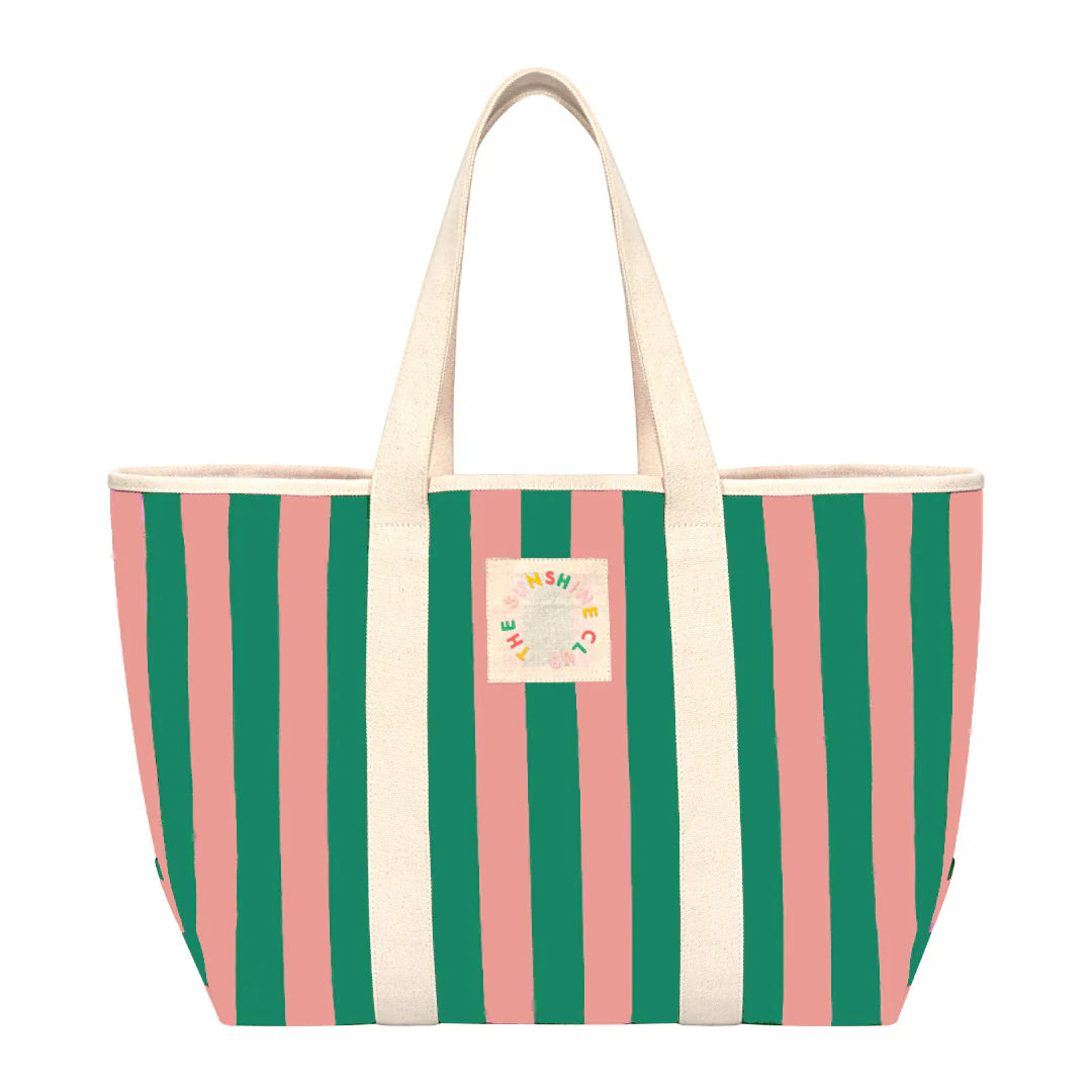 The Watermelon Stripe Canvas Tote is a bold and fun carryall with a zip closure. Created from a durable duck canvas, this spacious tote is perfect for beach days, shopping trips, or casual outings. Its sturdy design and playful colors make it both practical and stylish for all your summer adventures.