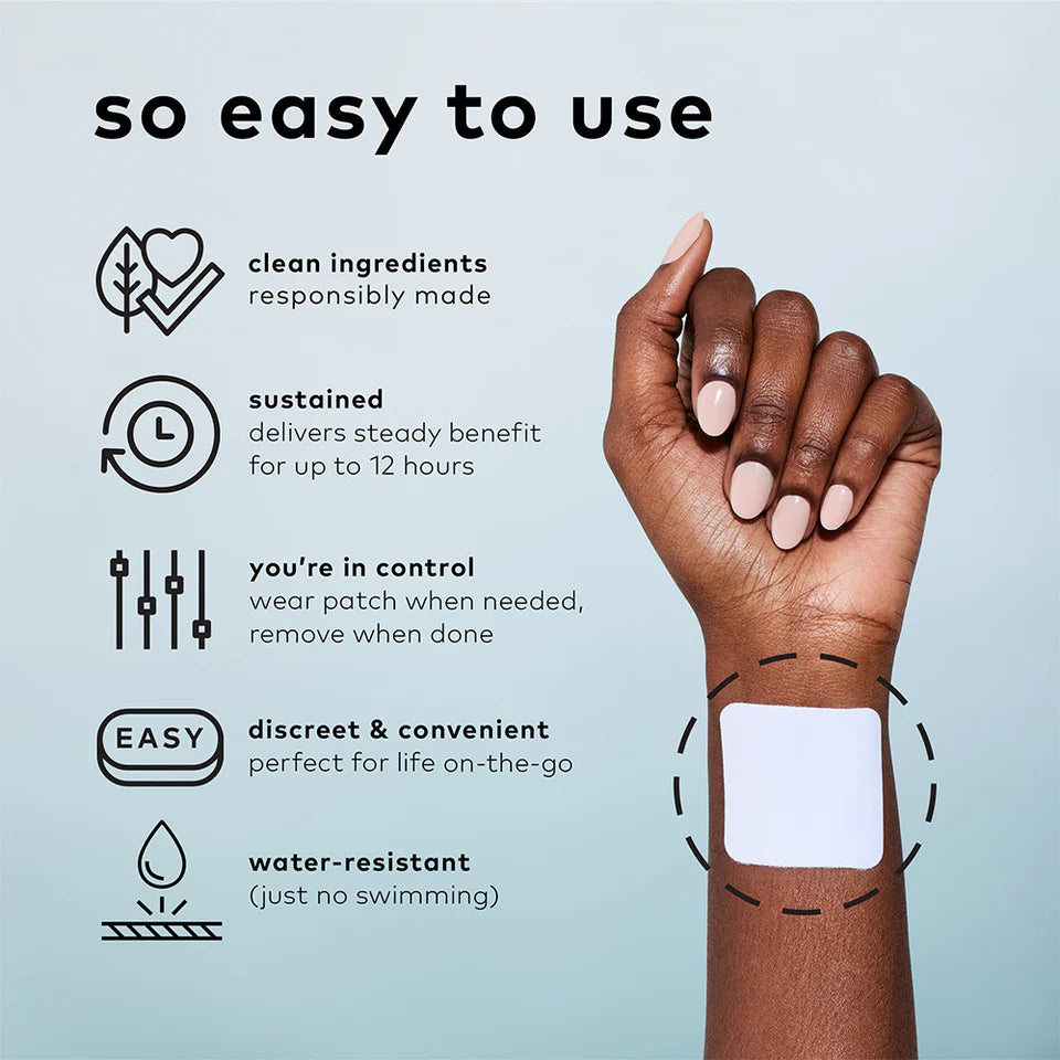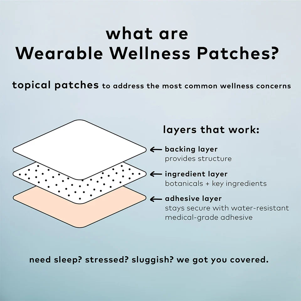 Wearable wellness patches delivering sustained and steady benefits over 8-12 hours.