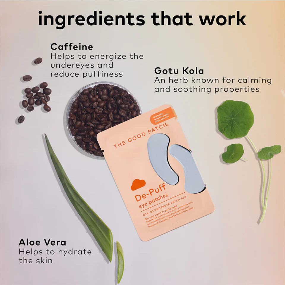 Cooling hydrogel under eye patches to reduce the appearance of puffiness. Infused with Caffeine, Aloe Vera, and Gotu Kola. Perfect for after a night out or a just a good old-fashioned cry sesh.